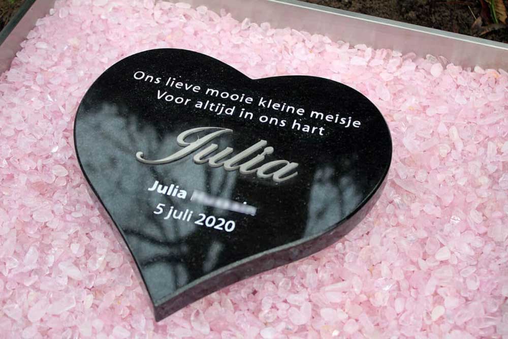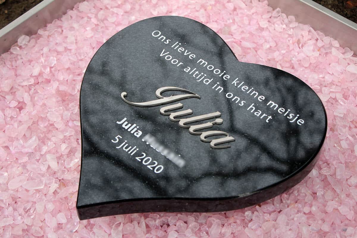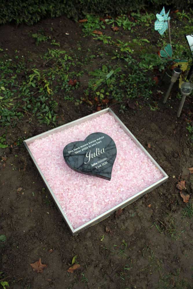 Het grafsteentje in hartvorm is gemaakt van een donkere steensoort. Het hartje is gemaakt van Indian Black graniet, diep gepolijst voor een zachte glans waardoor het prachtig contrasteert met de lichtroze ondergrond van de rozenkwarts. De naam Julia is in sierlijke letters uit RVS gesneden en zorgvuldig op het hartje bevestigd. De tekstregel “Ons lieve mooie kleine meisje – Voor altijd in ons hart” is met witte letters in de hartvormige steen gegraveerd, op verzoek van de ouders. Het grafje werd omlijnd met een subtiele RVS rand die de steentjes bij elkaar houdt.
