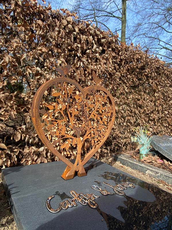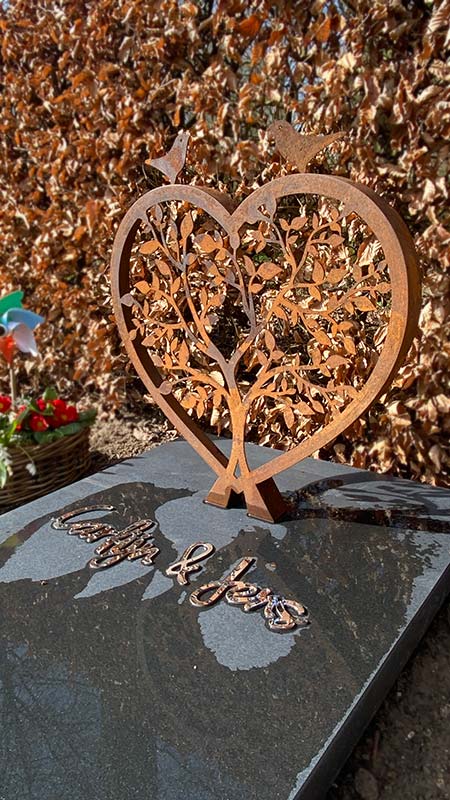 Tijdens ons gesprek bespraken we verschillende ideeën voor het monument. Stefan en Marloes wilden graag iets rustigs en ingetogens, zonder dat het te zwaar of pompeus zou worden. Een hartvorm sprak hen aan. In dat hart wilde ik een fijn uitgesneden levensboompje verwerken. Boven op het hart kwamen twee kleine vogeltjes van cortenstaal te zitten. Het hart staat symbool voor de band tussen de kinderen en hun ouders. De vogels verwijzen naar de twee kindjes zelf.