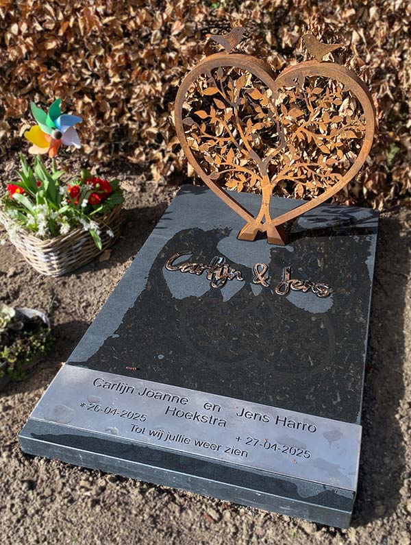 Dit babygraf voor Carlijn en Jens staat op de begraafplaats in Marknesse. Het monument bestaat uit een cortenstalen hart met daarin een fijn uitgesneden boompje. Bovenop het hart zitten twee kleine vogels. Het geheel staat op een liggende steen van zwart graniet waarin de namen van de kinderen in gepolijst RVS zijn geplaatst.