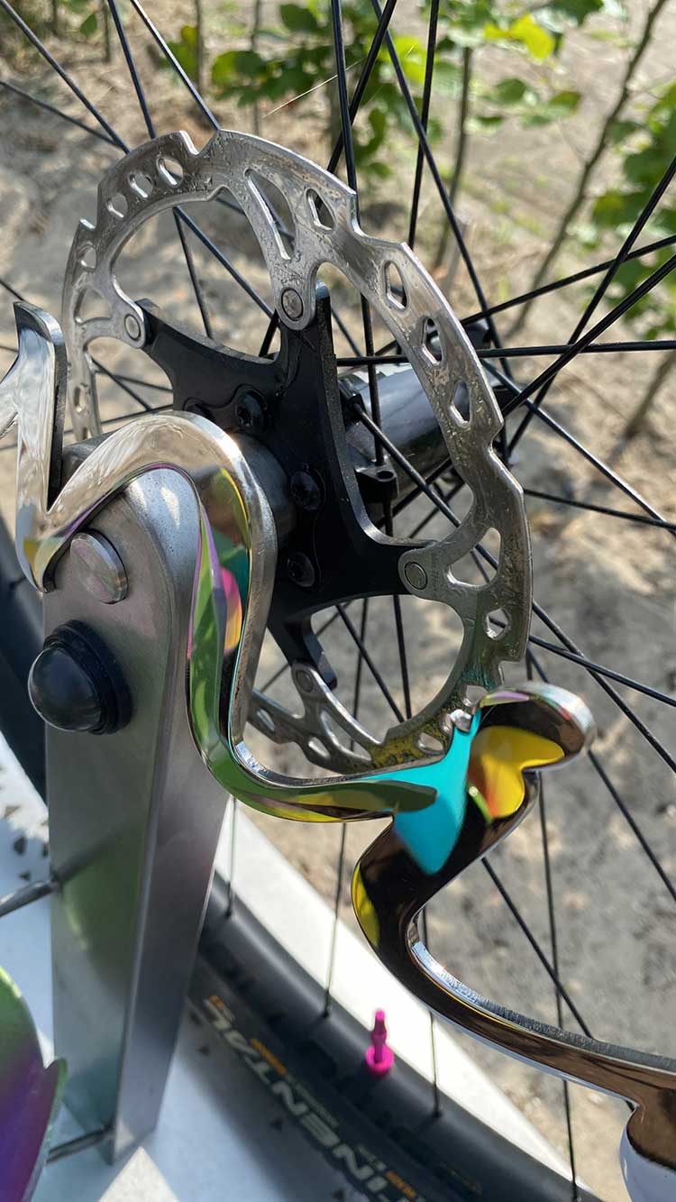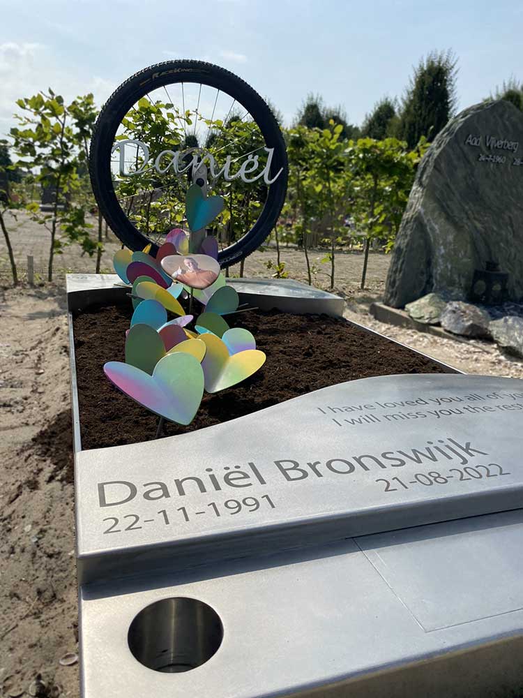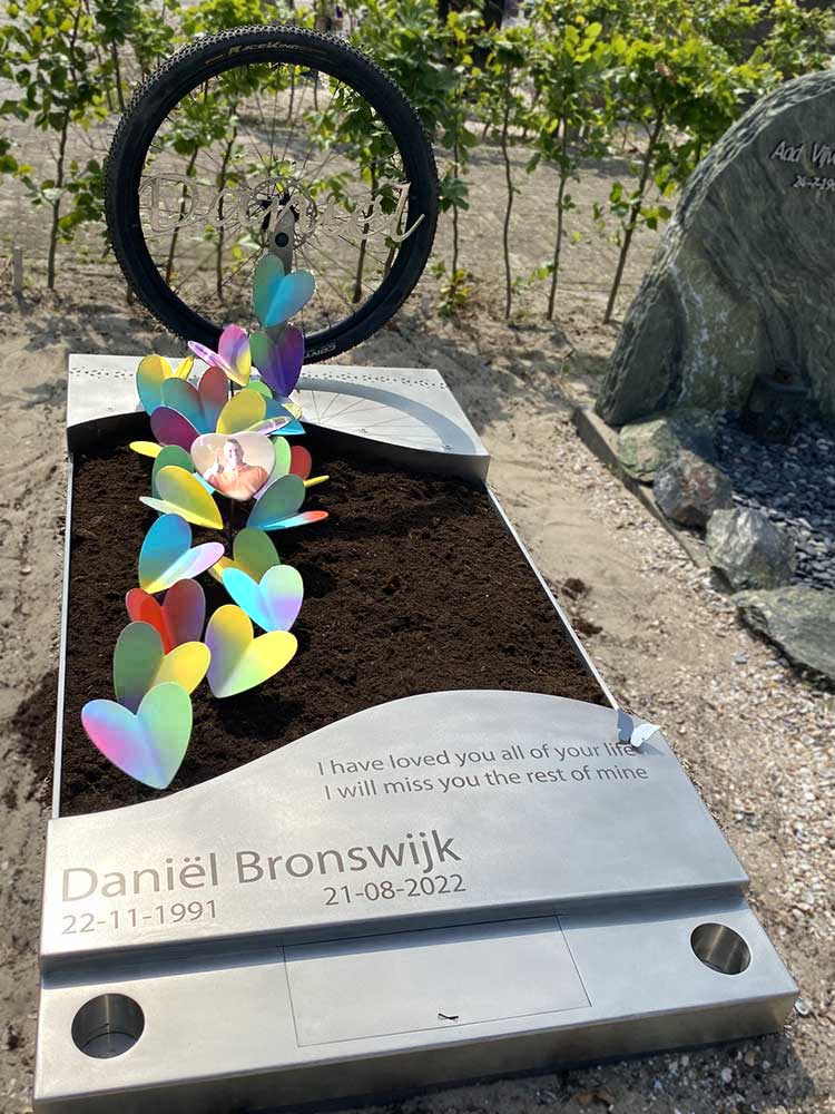 Meest prominent is het originele fietswiel (met roze ventieldopje) van zijn mountainbike. Gemaakt van een superlichte legering staat het fietswiel aan het hoofdeinde van het grafkunst object. Het wiel kan draaien. Voor het wiel staat zijn naam in gepolijste RVS letters. Het wiel wordt van onderen aangelicht met led lampjes. De oplaadbare accu zit in het grafmonument verwerkt.