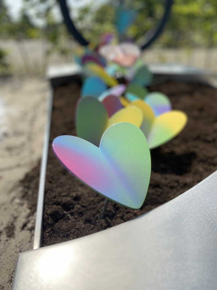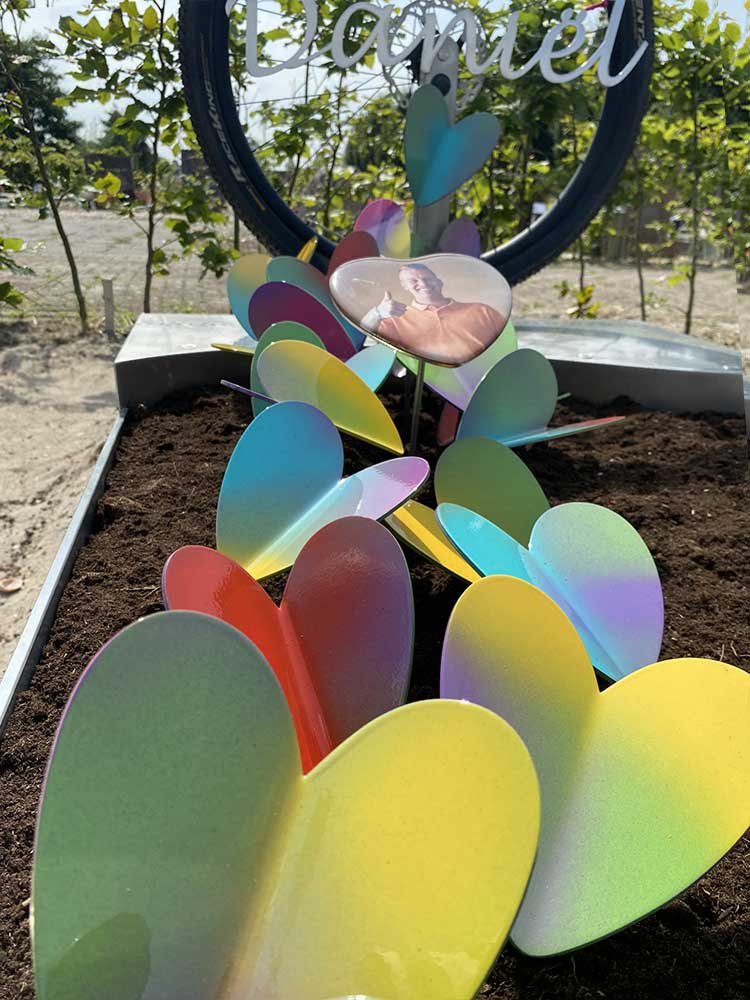 Het ontwerp met het fietswiel en een spoor van hartjes was favoriet. Samen met de familie pasten we nog een aantal details aan. Zo mocht de verdeling van de hartjes wat rommeliger worden en moest er ruimte komen voor bloemenvazen en graflantaarns