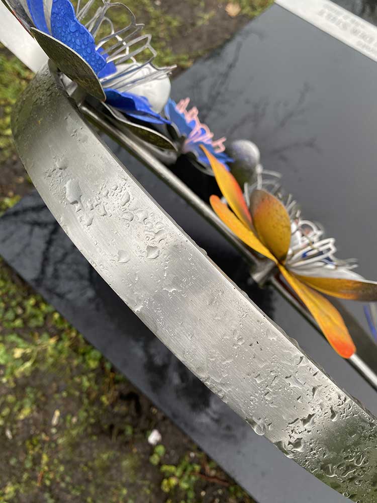 Van de papieren bloemen maakten we op verzoek van de nabestaanden eerst een paar van RVS ter beoordeling. Uiteindelijk werd opdracht gegeven om 7 bloemen te maken. In een later stadium werd nog een extra bloem besteld. Iedere bloem is uniek en staat voor een familielid.
