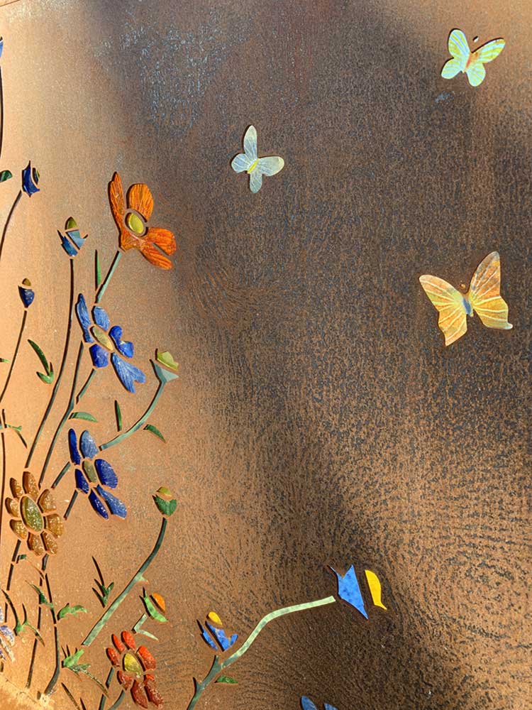 Een artistiek gedenkteken van cortenstaal met gekleurde veldbloemen en vlinders van glas voor echtgenote.