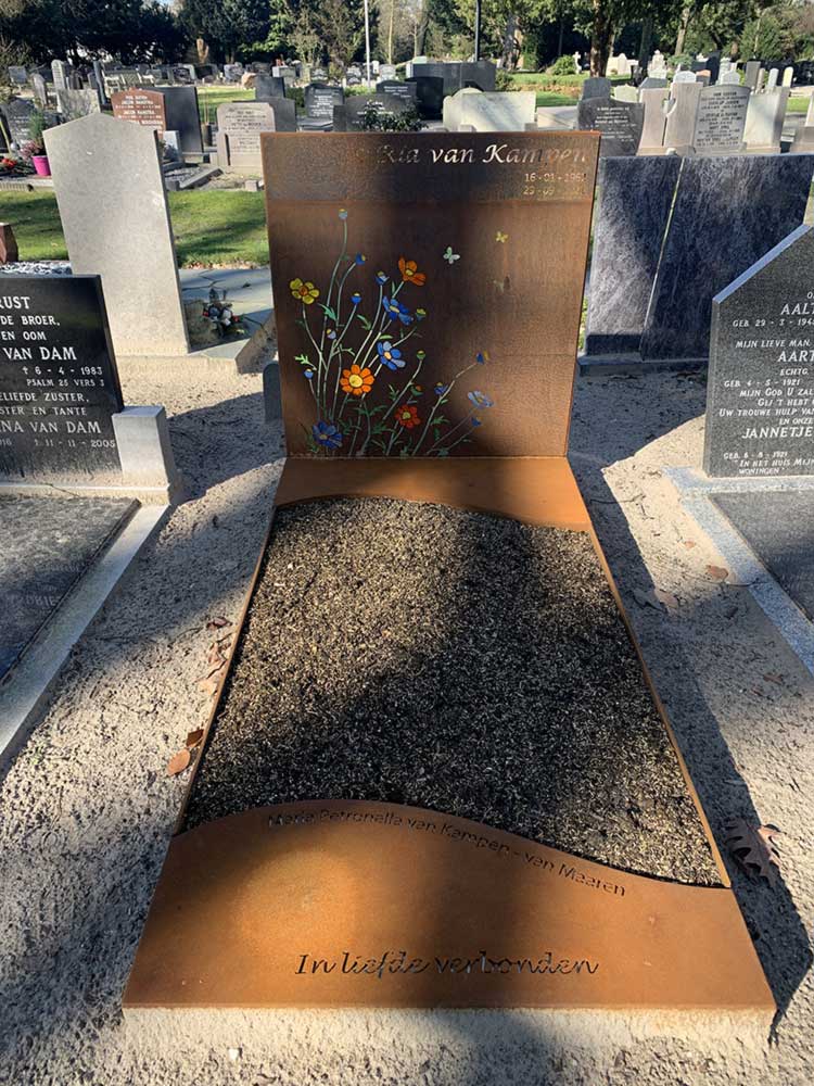 Eerst maakte ik een serie kleine kartonnen modellen met verschillende ontwerpen voor een grafmonument van cortenstaal met gekleurd glas. Het ontwerp met veldbloemen en vlinders kregen de voorkeur. Voor Gijsbert die later bijgezet wordt is in het monument ruimte gehouden. Het hartje voor de naam van Ria wordt dan het symbool van verbintenis tussen Ria en Gijsbert.