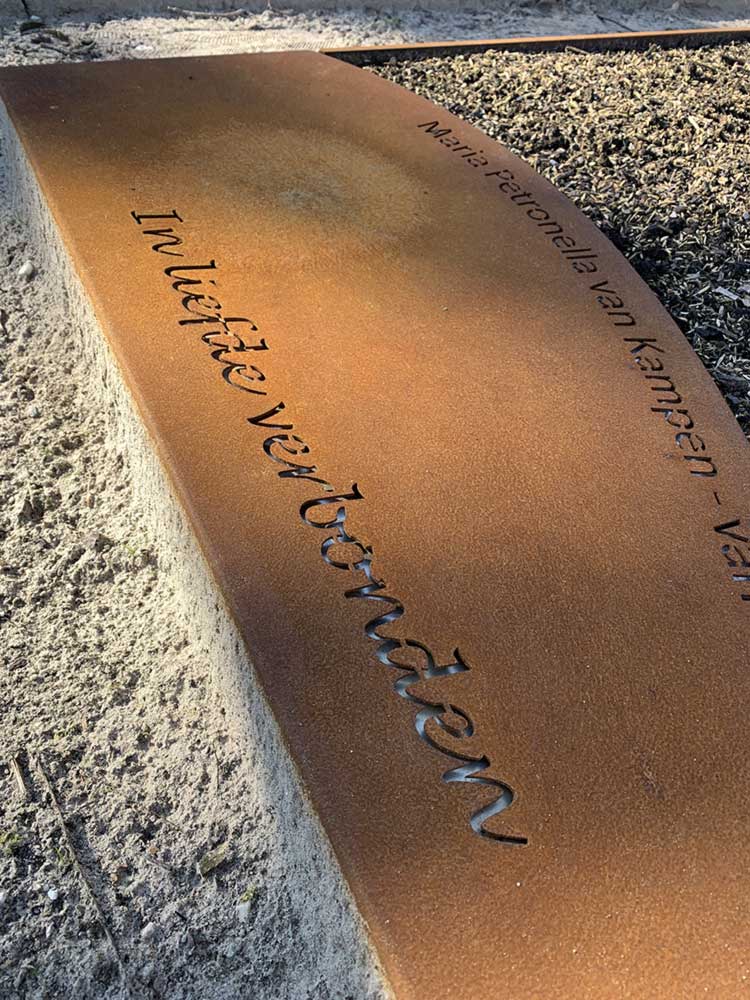Bovenstaand ontwerp werd unaniem door de familie gekozen. Dit werkte ik eerst nog uit tot een mock-up op ware grootte. Na nog wat kleine aanpassingen begonnen we met de uitvoering. Het uitsnijden in het cortenstaal moest overeenkomen met de glazen bloemen die erin geplaatst werden. Dat was een forse uitdaging waarvoor we verschillende proeven maakten. In overleg met de familie werden ook de kleuren gekozen. Hoewel de vorm, het materiaal en de kleuren bekend zijn blijft iedere keer weer een bijzondere verrassing als het monument in het echt gezien wordt.