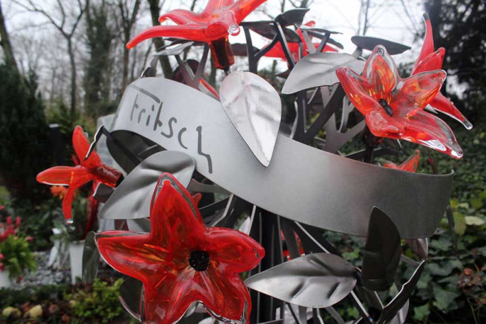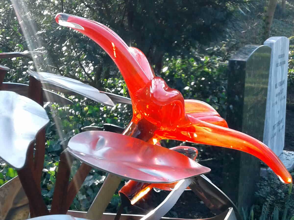 Een eigentijds grafmonument met glas was het verzoek van de de nabestaanden. Een monument dat eer moest brengen aan Marja moest ook ruimte laten voor haar geliefde partner. Licht, uitbundig en kleurrijk – moest het worden, anders dan de gebruikelijke stenen. In ons eerste gesprek ontstond het idee voor een “uitbundige fantasy” boom als symbool van haar kracht met kleurrijke bloemen – symbool voor bloei. We kwamen al snel op een boompje dat uit twee verschillende materialen zou bestaan (de 2 geliefden) met gekleurde bloemen van glas. Het monument dat kracht, groei en bloei verbeeldt. Uitbundig en kleurrijk.