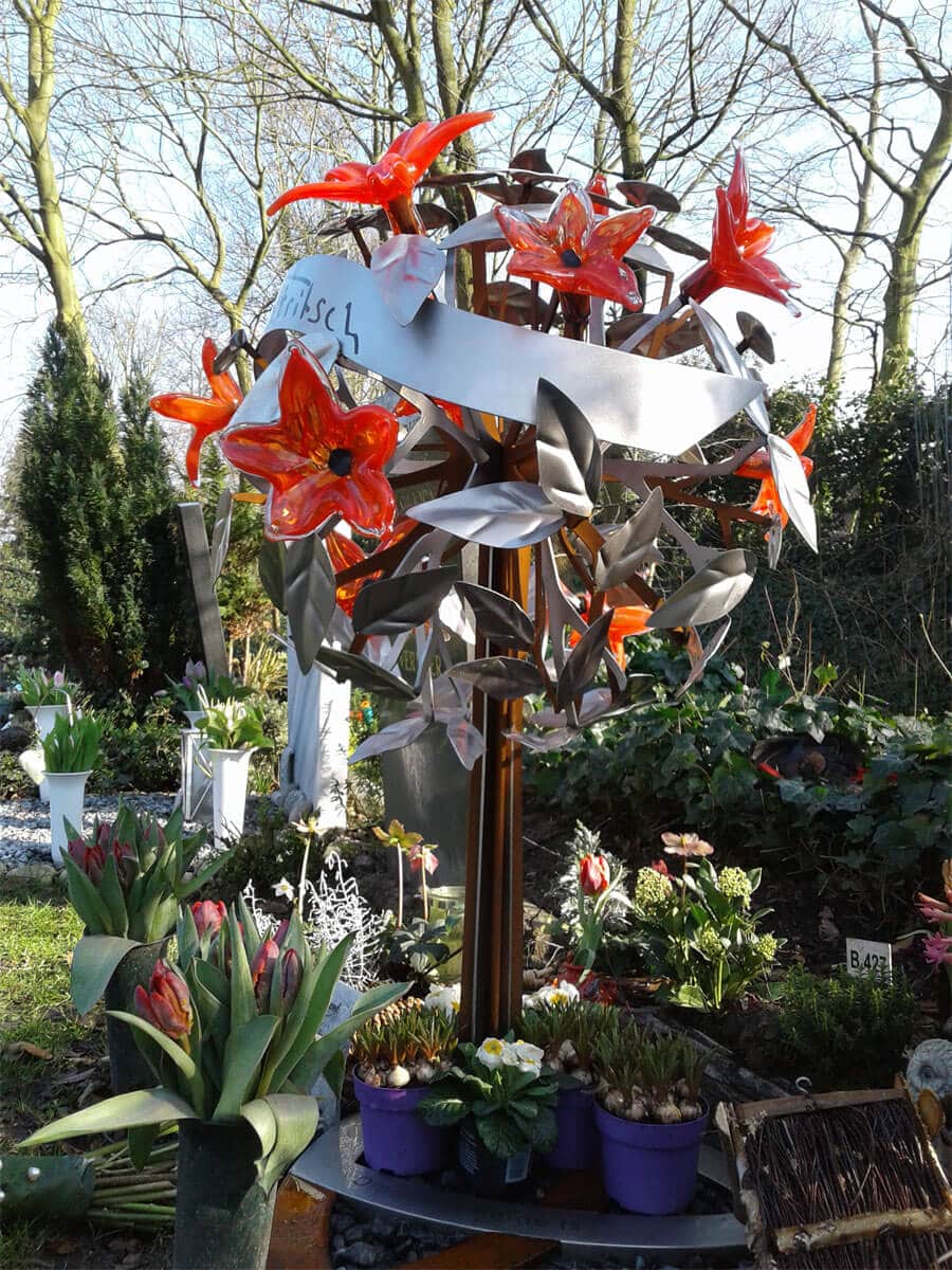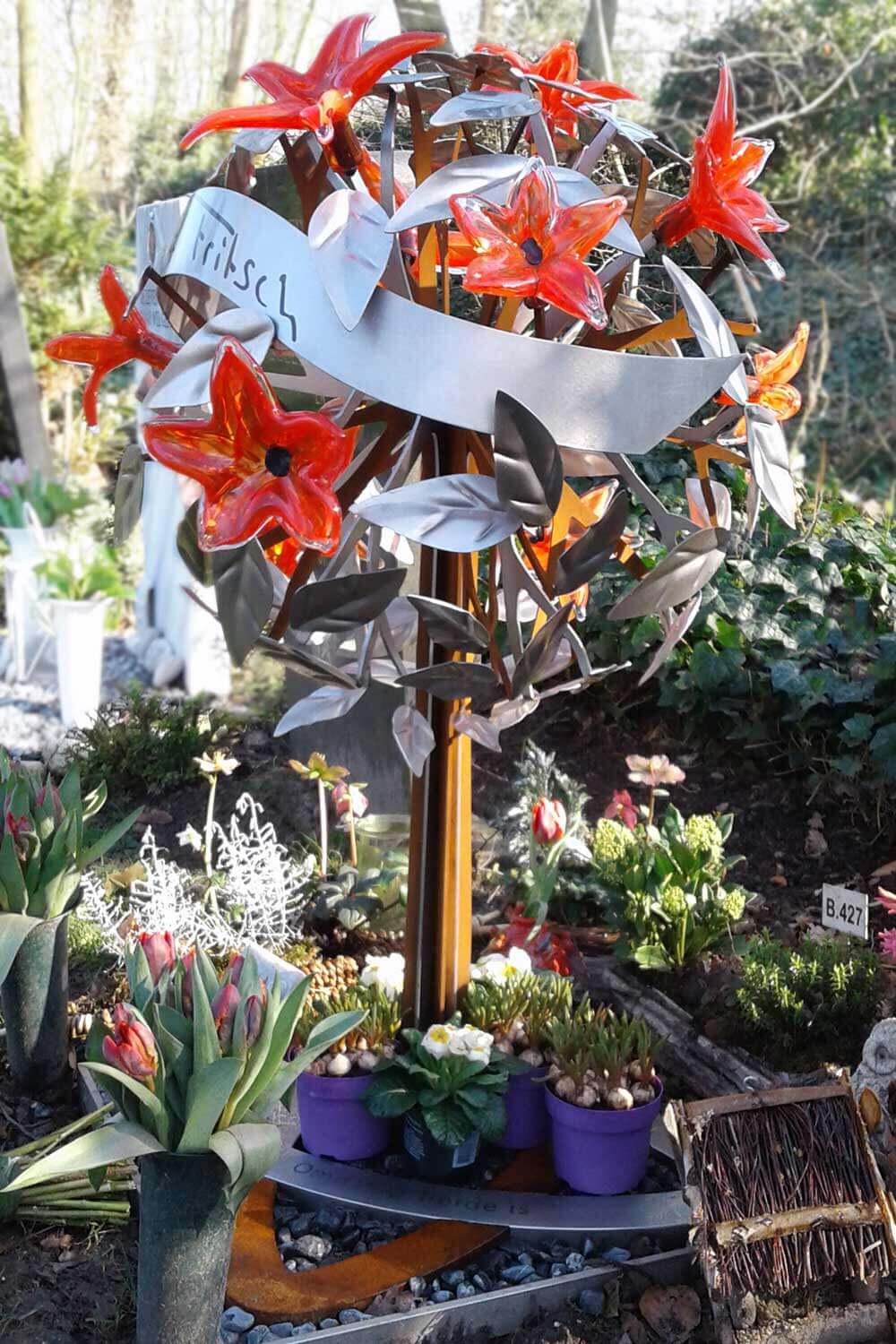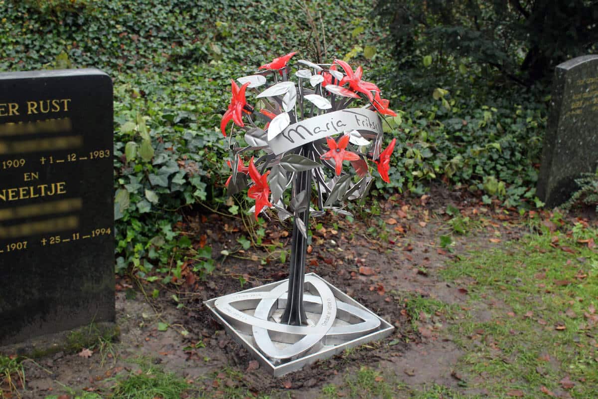 Uit een aantal ontwerpen kozen de nabestaanden na enig overleg en discussie uiteindelijk samen voor hetzelfde ontwerp. Een bijzondere boom die bestond uit twee in elkaar gegroeide bomen: één van geroest staal (corten) en een ander van RVS. De boom in het eigentijdse grafmonument met glas was een combinatie van twee onderdelen die qua aard en karakter verschillen, maar samen wel een eenheid vormen.