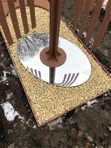 We besloten het monument van RVS te maken en dat in een cortenstalen look te poedercoaten. De reden om dit te doen waren tweeledig: we wilden geen roestwater op de RVS spiegel, maar misschien nog wel belangrijker, nu hadden we controle over de kleur! Cortenstaal kan op den duur erg donker worden en vooral met nat weer kan het corten nogal donker ogen.