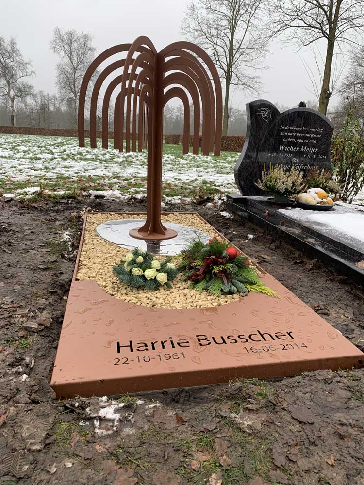 Een bijzonder grafmonument in cortenstalen look RVS met een prachtige gestileerde boom voor Harrie.