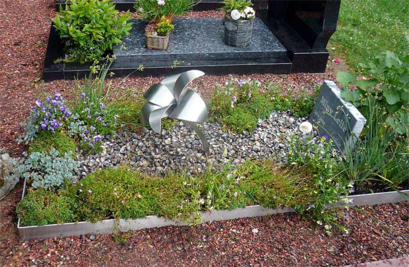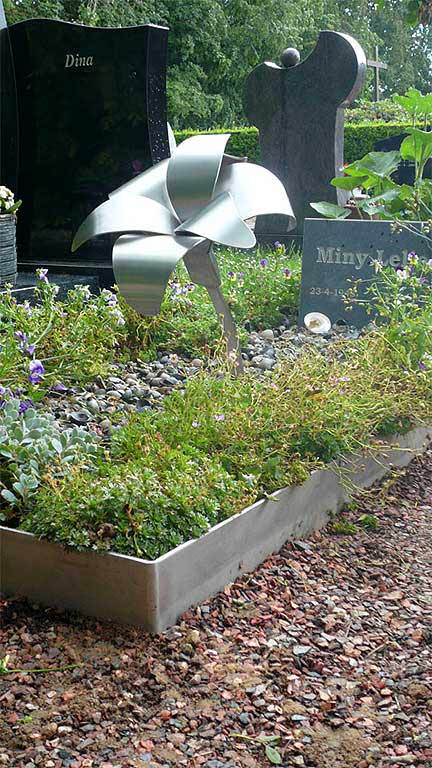 Een artistiek en ingetogen RVS grafmonument op de begraafplaats. Het graf is begrensd met een roestvrij stalen rand. Binnen dit kader liggen schelpen en is beplanting aangebracht. Centraal op het graf staat de heldere RVS lelie. Deze verbeeldt de familienaam die op een bescheiden granieten grafsteentje staat en verschillende plantjes completeren dit bijzondere grafmonument.