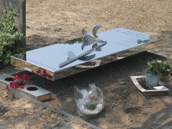 Het eigentijdse grafmonument met lelie voor Marianne bestaat uit een RVS plaat die gepolijst is als een spiegel. De plaat lijkt visueel te zweven door de poten eronder niet zichtbaar zijn. De plaat spiegelend roestvrij staal hemel weerspiegelt de hemel. Je ziet de wolken voorbij drijven en ook flitst af en toe een vogel voorbij.
