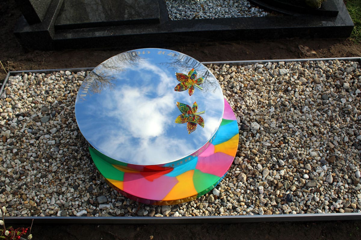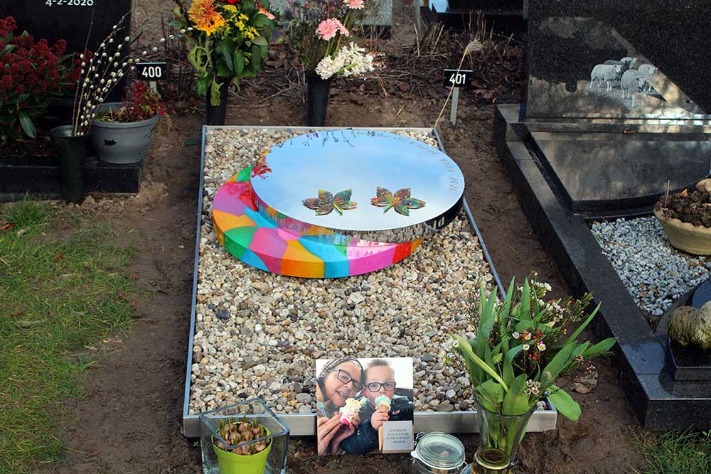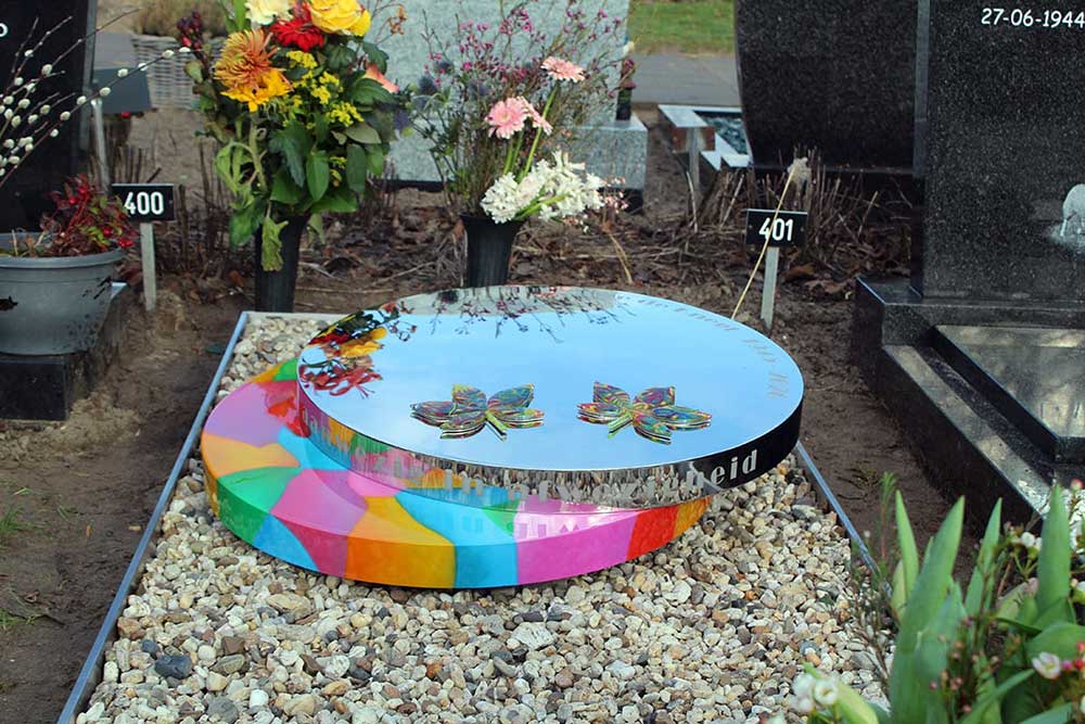 Modern RVS grafmonument met veel kleur