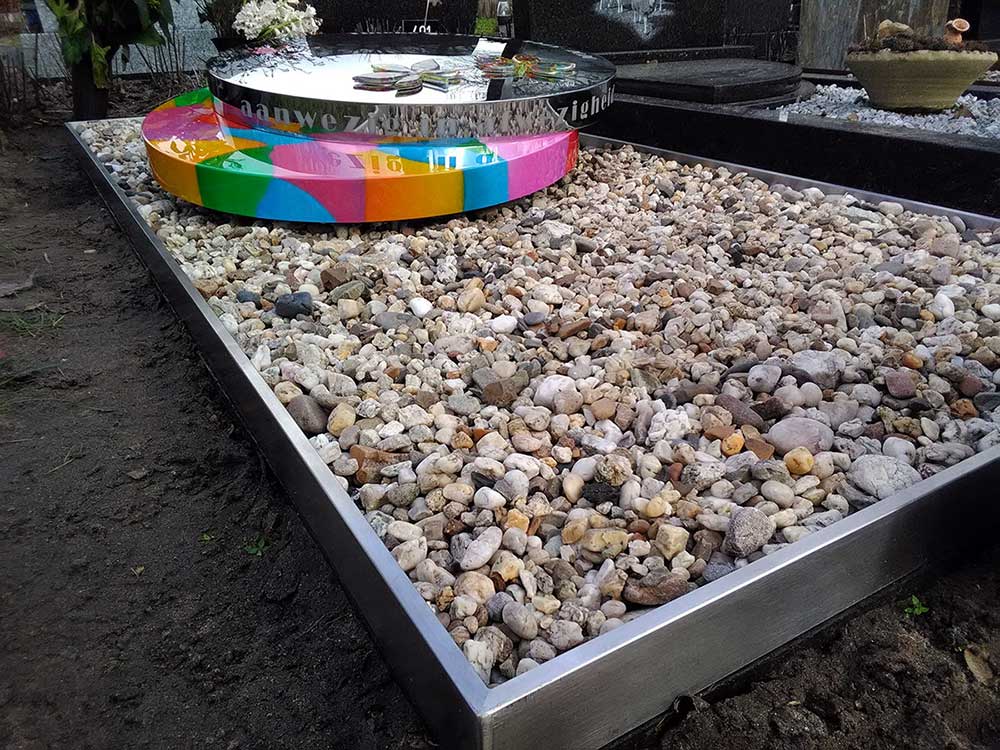 Het is een modern RVS grafmonument met veel kleur geworden. Eigenlijk zou ik het liever grafkunst willen noemen. De verschillende onderdelen zijn allemaal met veel zorg en creativiteit gemaakt. Alles is puur handwerk dat door bevlogen vakmensen is uitgevoerd.