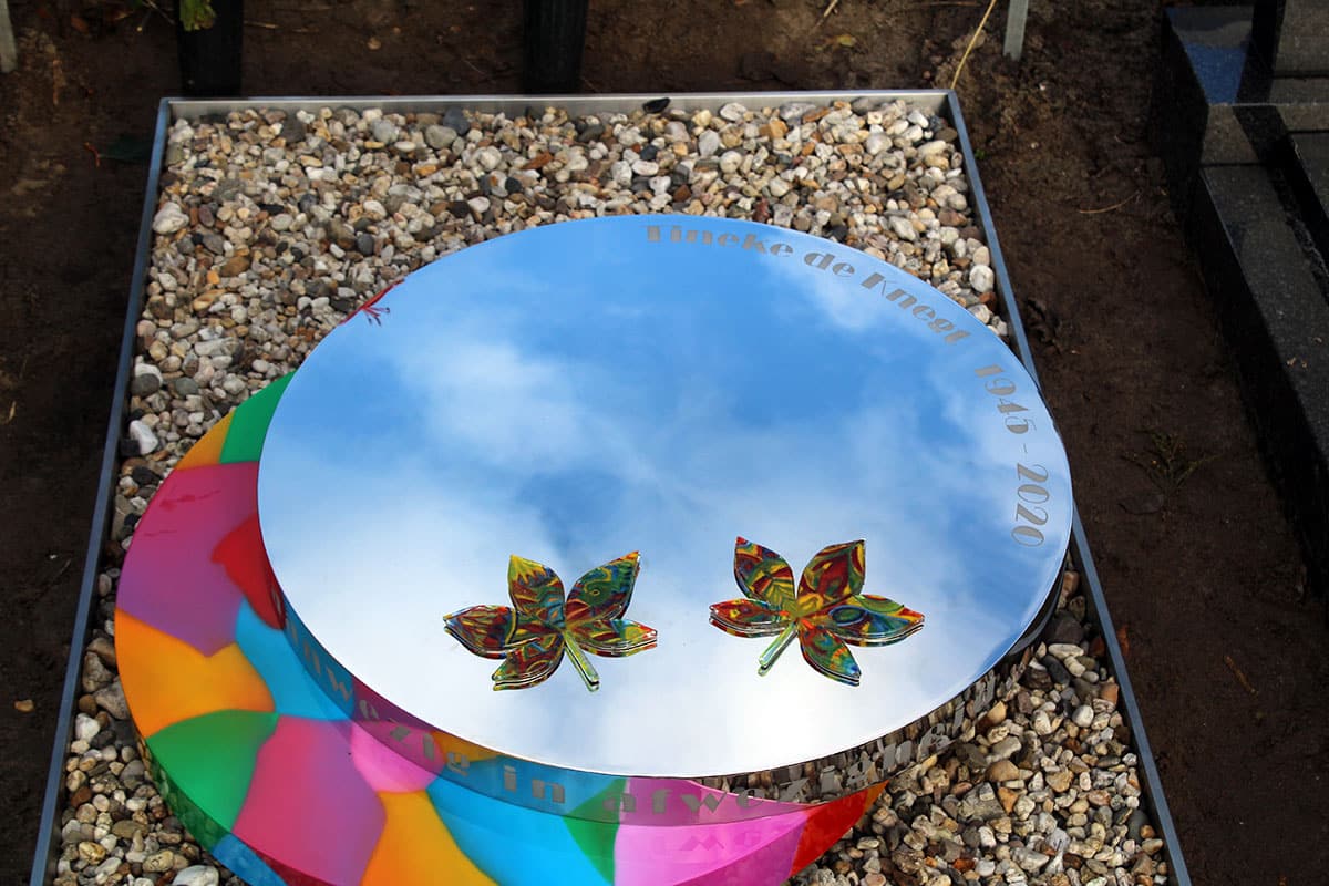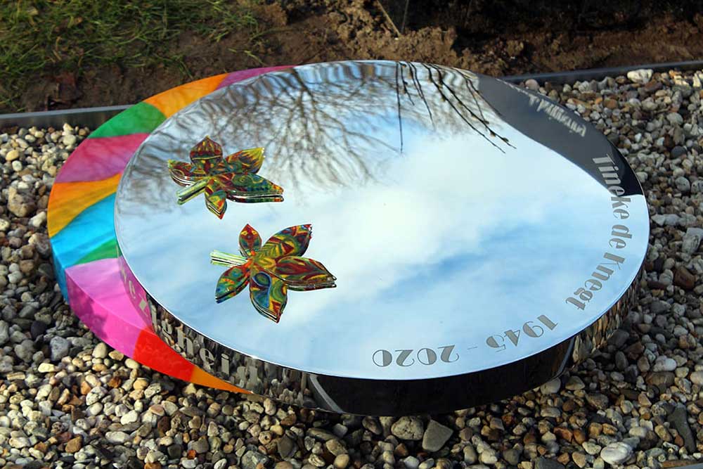 Een modern rvs grafmonument met veel kleur voor Tineke – een kleurrijke dame
