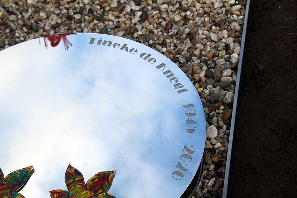 Het ontwerp voor het eigentijdse RVS gedenkteken bestaat uit 2 RVS schijven met daarop 2 kastanje bladeren van glas. De onderste schijf draagt de favoriete en kenmerkende kleuren van Tineke. We gebruikten daarvoor de kleuren van een vest dat ze mooi vond. Half daarop ligt een RVS schijf die tot een spiegel is gepolijst. De kleuren en de hemel weerkaatsen in het RVS. Op deze schijf liggen weer 2 handgemaakte kleurrijke kastanje bladeren van glas. Om het graf kwam een dunne RVS rand waarbinnen steentjes kwamen. De familie vond het een mooi idee om daarvoor het grind rondom de ouderlijke boerderij te gebruiken. Het grind werd natuurlijk eerst gewassen.