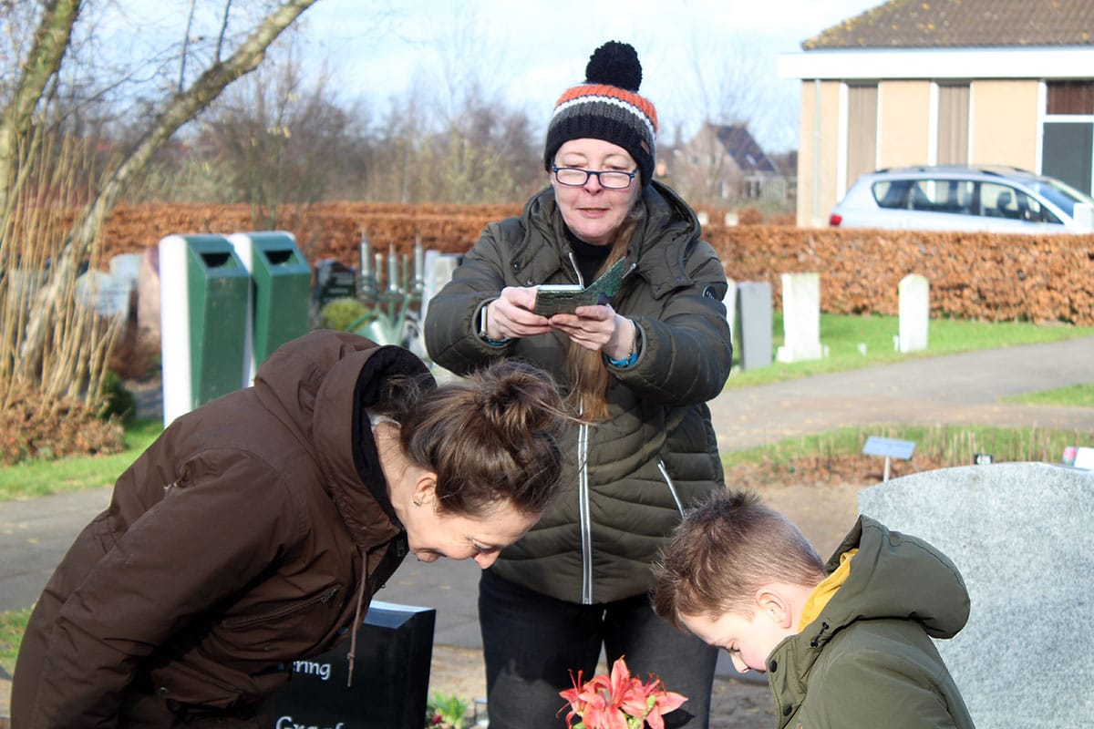 Op een winderige dag met een blauwe hemel met witte wolken die voort gejaagd werden plaatsen we samen het monument. Beide schoonzonen droegen het grafmonument samen naar het graf. De dochters en kleinzoon droegen het RVS kader en bepaalden ter plekke de juiste positie van het gedenkteken voor hun ouders. Vervolgens hielp iedereen met het voorzichtig verspreiden van het gewassen grind. Nadat bloemen geplaatst waren maakten beide dochters en kleinzoon nog een foto van hun weerspiegeling in het monument. De weerspiegeling van de voorbij waaiende wolken in het monument was heel bijzonder om te zien.