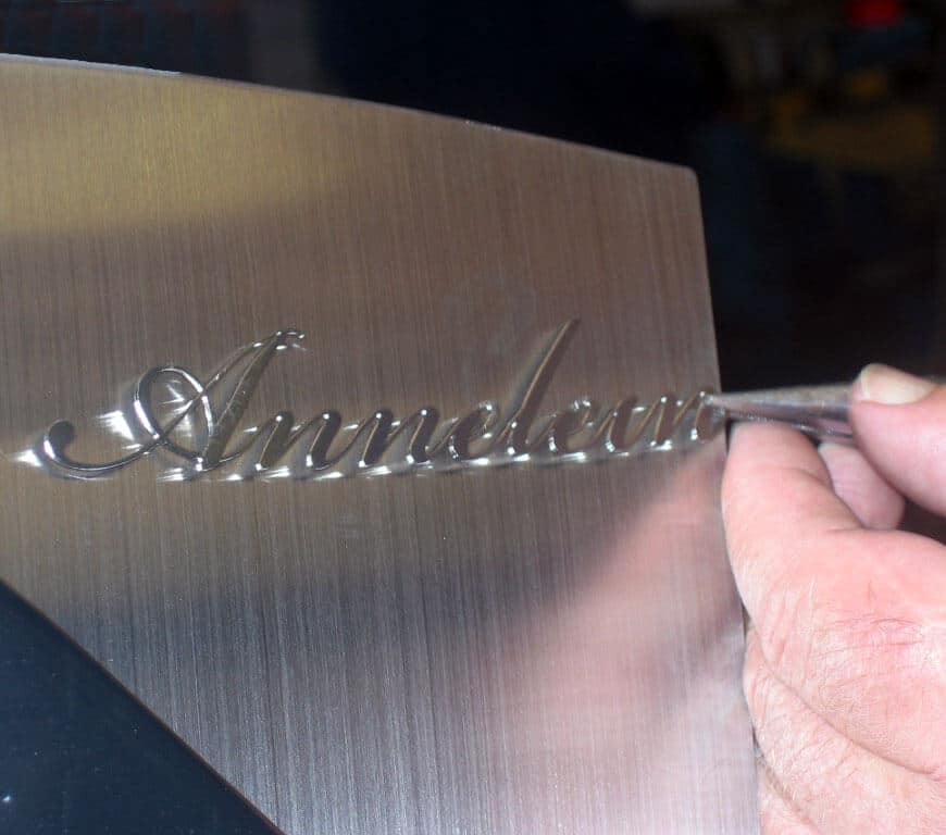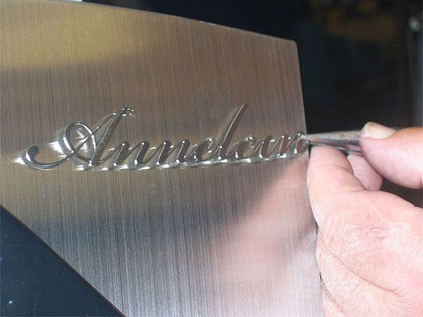 Pas toen we helemaal zeker waren dat de vormen en de maten klopten begonnen we met de uitvoering in RVS. Met laser sneden we de vormen uit en bogen deze zorgvuldig in de correcte kromming en vorm (gewalst). We werkten het grafmonument netjes af. Het RVS werd heel secuur geslepen. De letters van Yanick’s naam sneden we heel zorgvuldig uit rvs plaat en monteerden we op het eerste hart. Vrijwel alles was handwerk. Bij iedere handeling informeerden we de familie.